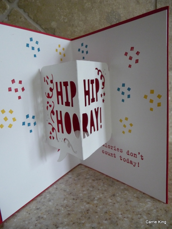 I had some time now that the Holiday Rush is over for me. The parties in The Villages are over and many people have left for Christmas or are busy with company. I finally have time to play with my new stuff. I love this new birthday suite of products. Both the cake on the front of the card and the Hip Hip Hooray on the inside can be popped out on the inside. The Party with Cake stamp set has lots of fun sayings for the inside. Just what we have been asking for!